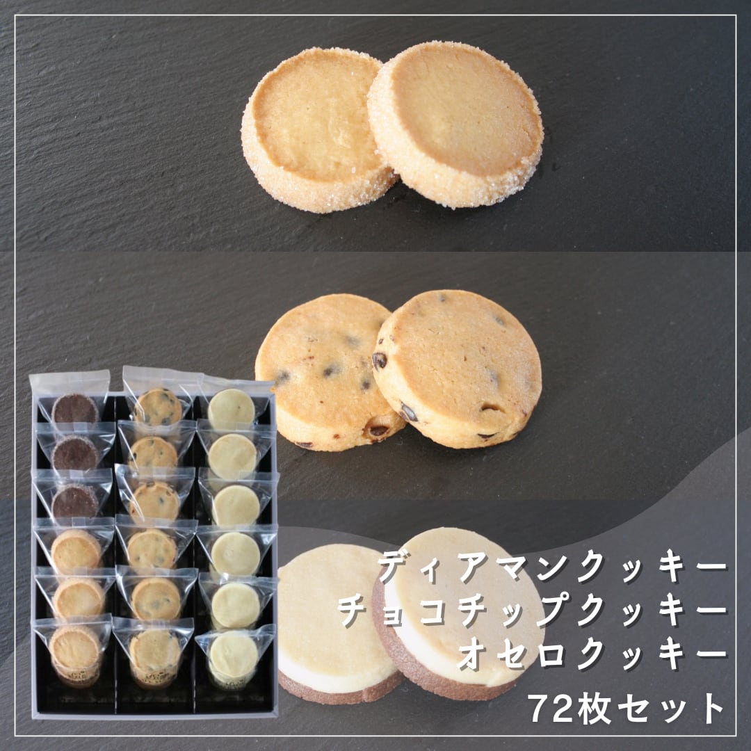 カフェ悠花では、ディアマンクッキー(プレーン&ココア)、チョコチップクッキー、オセロクッキーの72枚セットをご用意しております。厳選した素材を使用し、ひとつひとつ丁寧に焼き上げられています。口に入れるとほろっと崩れる絶妙な食感と、バリエーション豊かな味わいをお楽しみください。